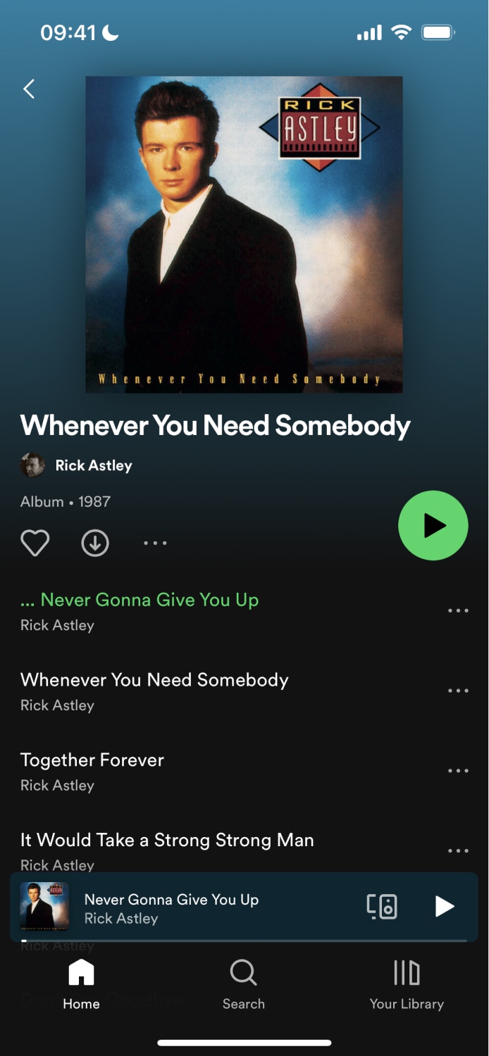The example below shows how the Spotify app reuses the same album component to show content in multiple tabs. Notice that each screenshot shows the same album but from a different tab.
